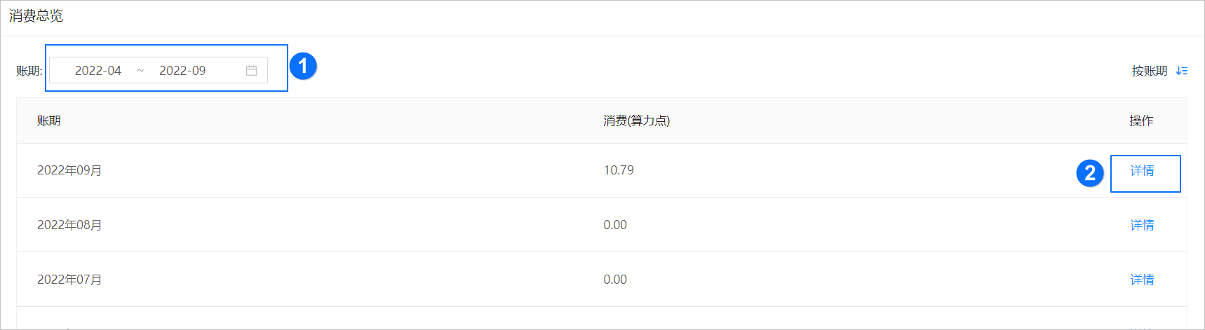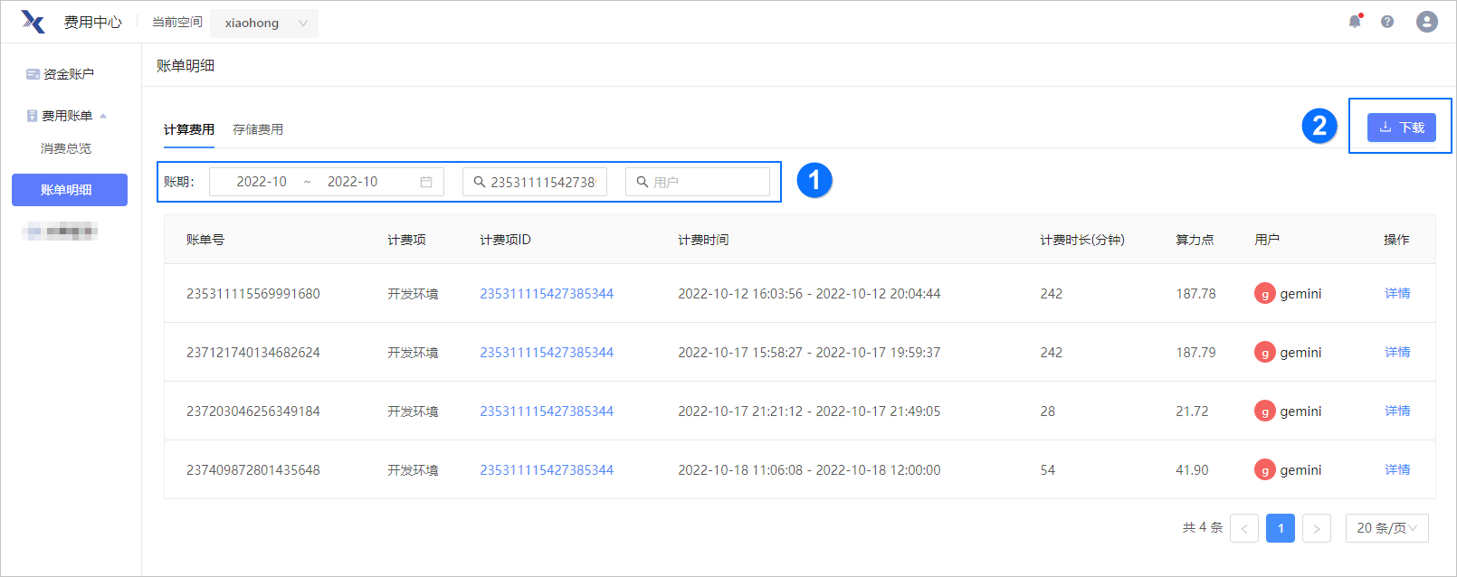 在图中 ① 处输入筛选条件,可筛选出相关账单。