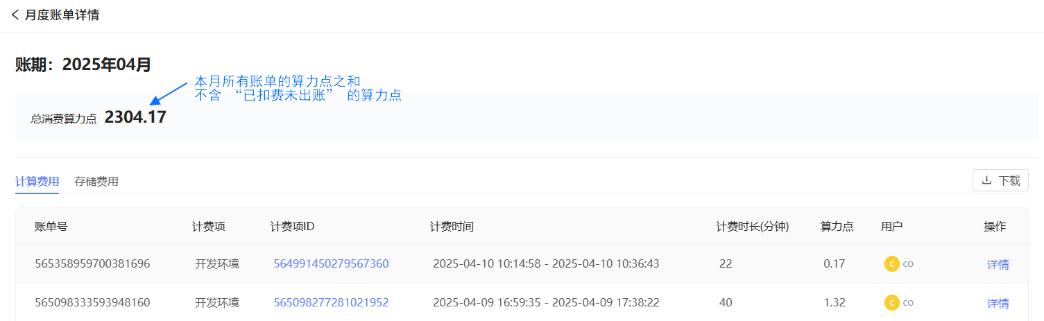 - 算力账单在任务停止或跨月时生成,在账单生成时和整点时扣费。