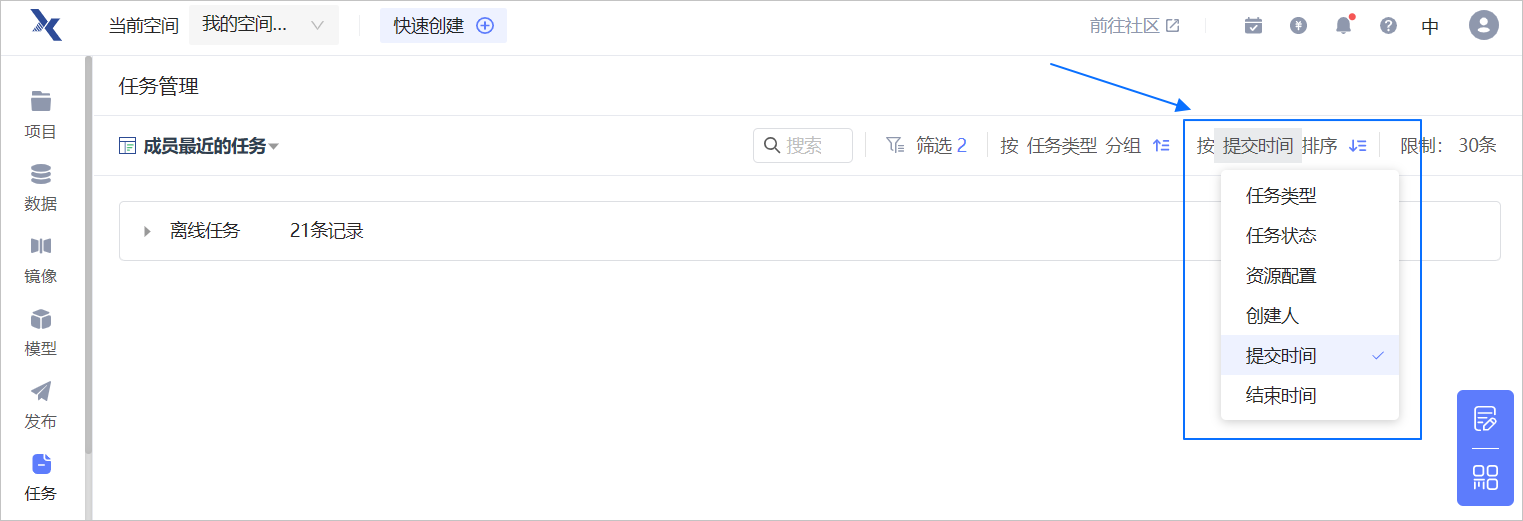 平台左侧导航栏选择 任务 ,默认进入 任务管理 页。