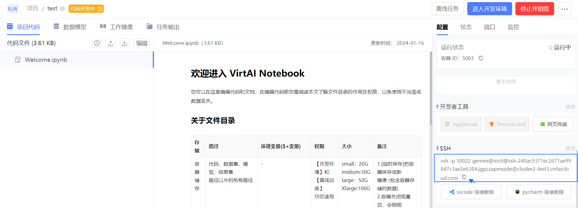 - 如果重启开发环境,“SSH” 信息可能变更,请留意界面提示,使用变更后的 “SSH” 连接。