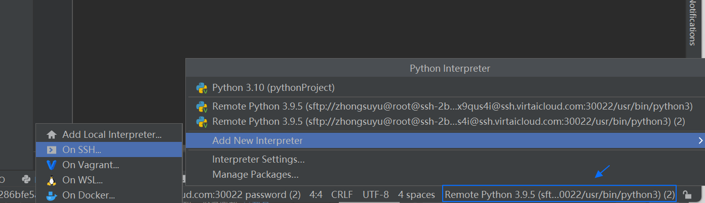 在您本地 Pycharm 中打开项目后,单击右下角解释器处,随后选择 Add New Interpreter,选择 On SSH。