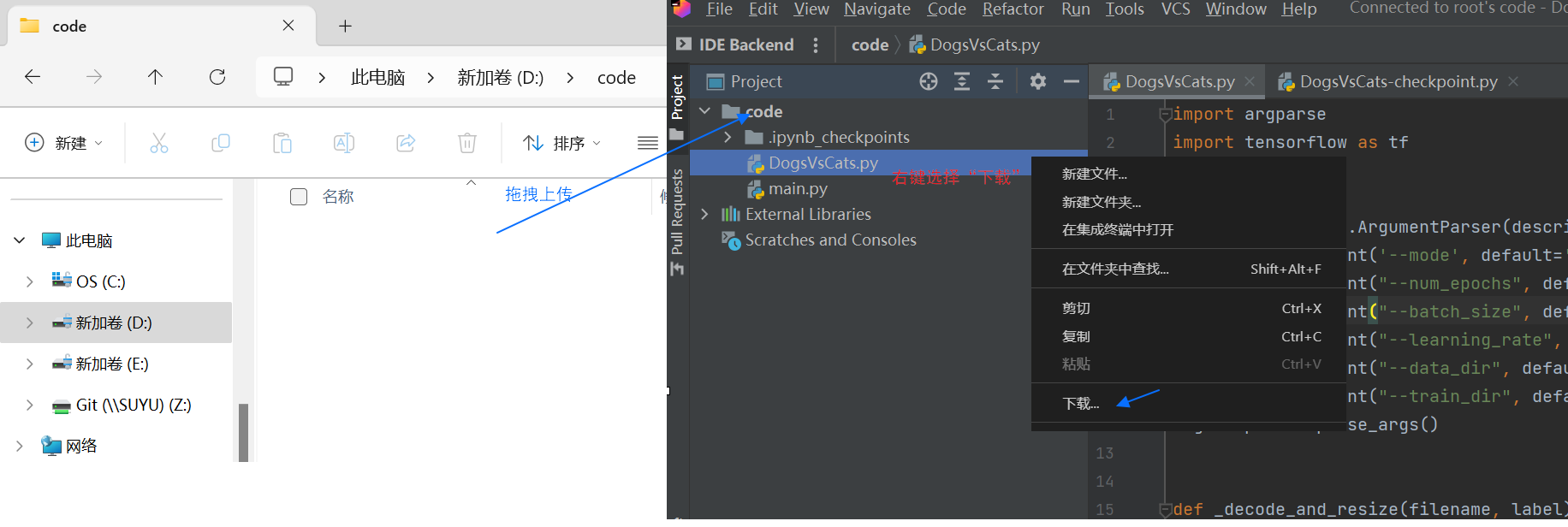 - 下载:鼠标右键单击 PyCharm 中远端待下载的文件,随后选择 下载。