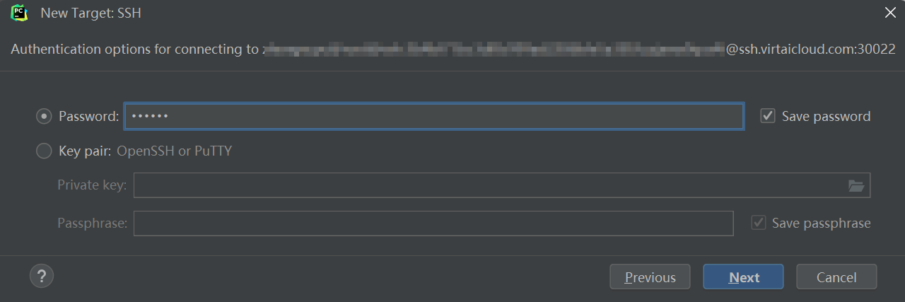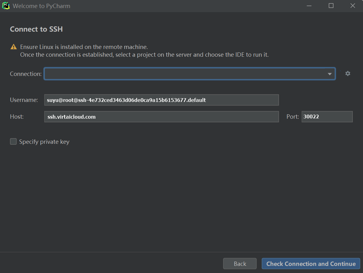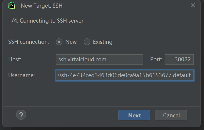 例如,复制的连接信息为ssh -p 30022 suyu@root@ssh-4e732ced3463d06de0ca9a15b6153677.default@ssh.virtaicloud.com,则对应的填写为:- User name:suyu@root@ssh-4e732ced3463d06de0ca9a15b6153677.default