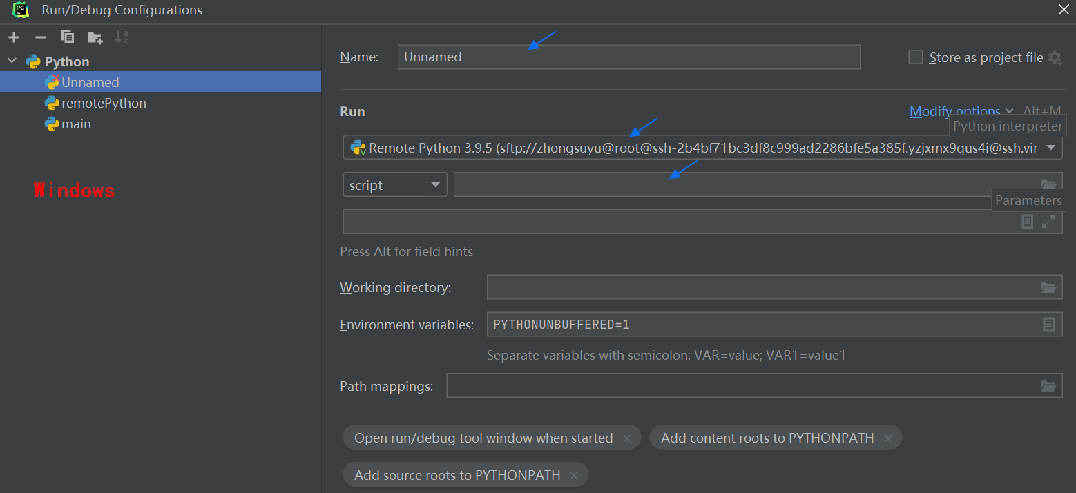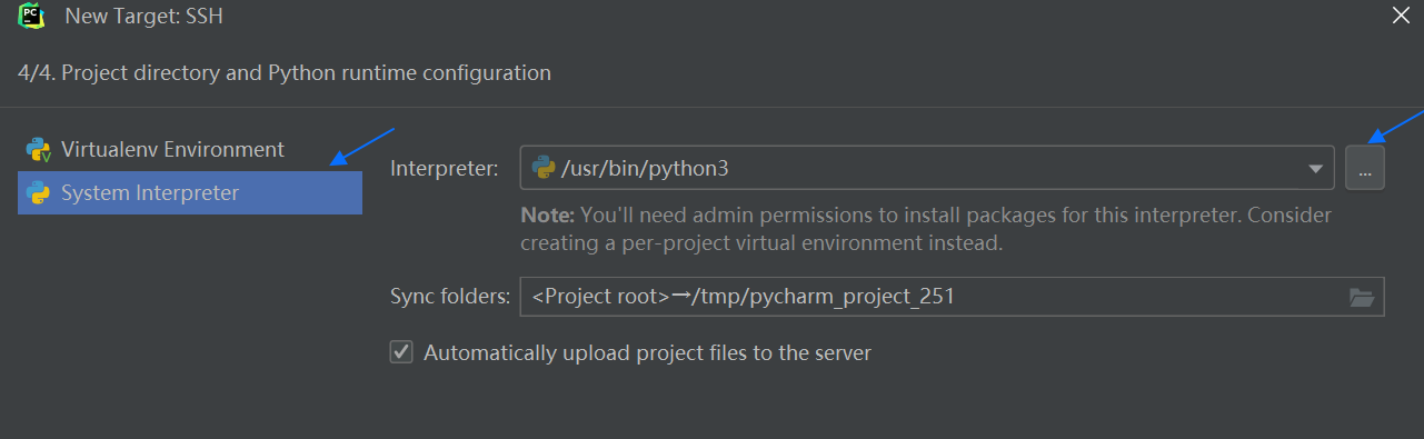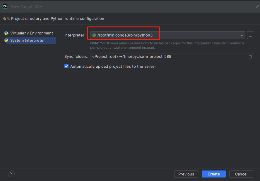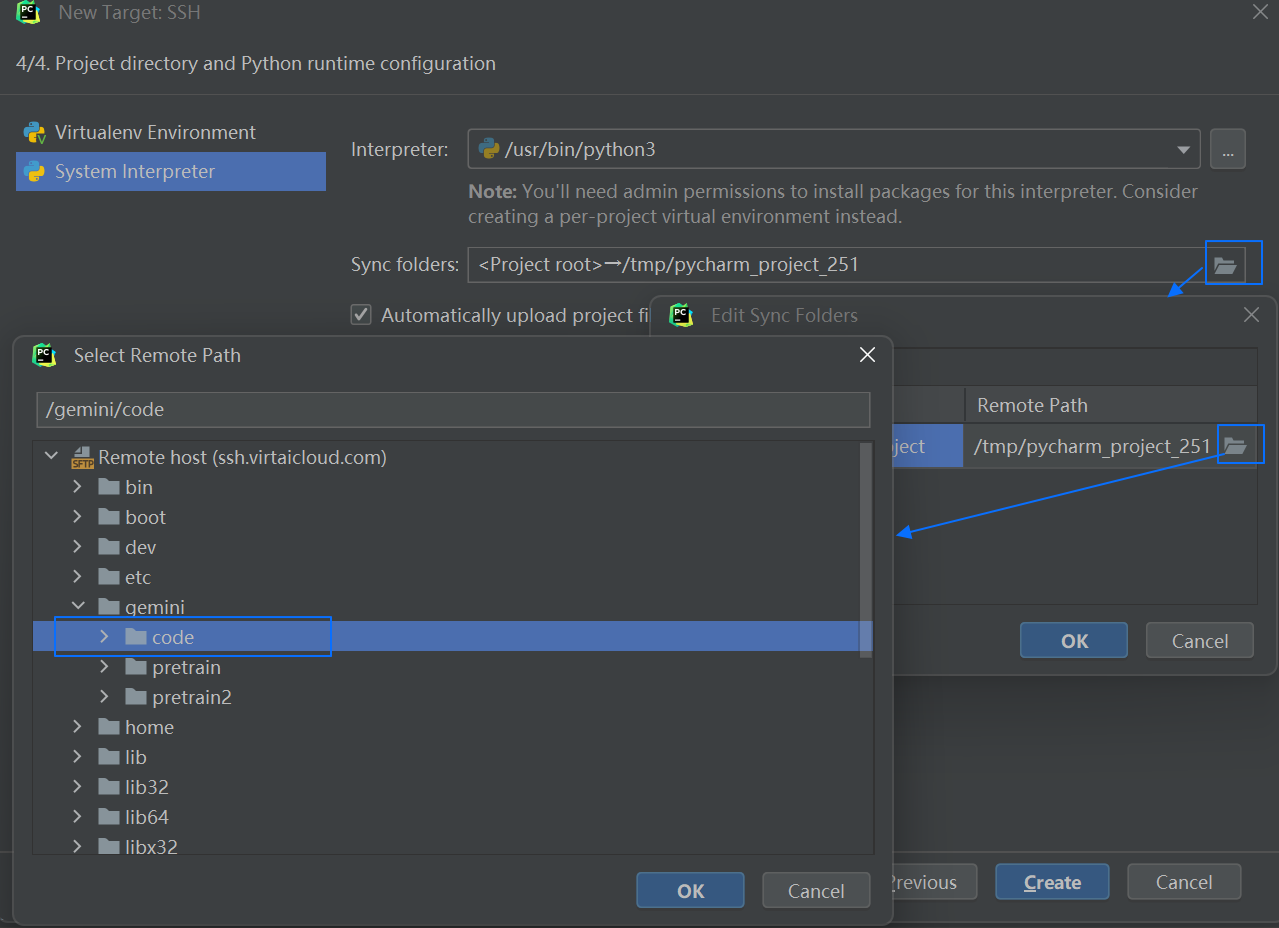 Interpreter '/usr/bin/python' doesn't exist on remote server,请参考 异常处理-无法找到解释器 处理。如果弹出如下对话框,则输入上述步骤 2 的
