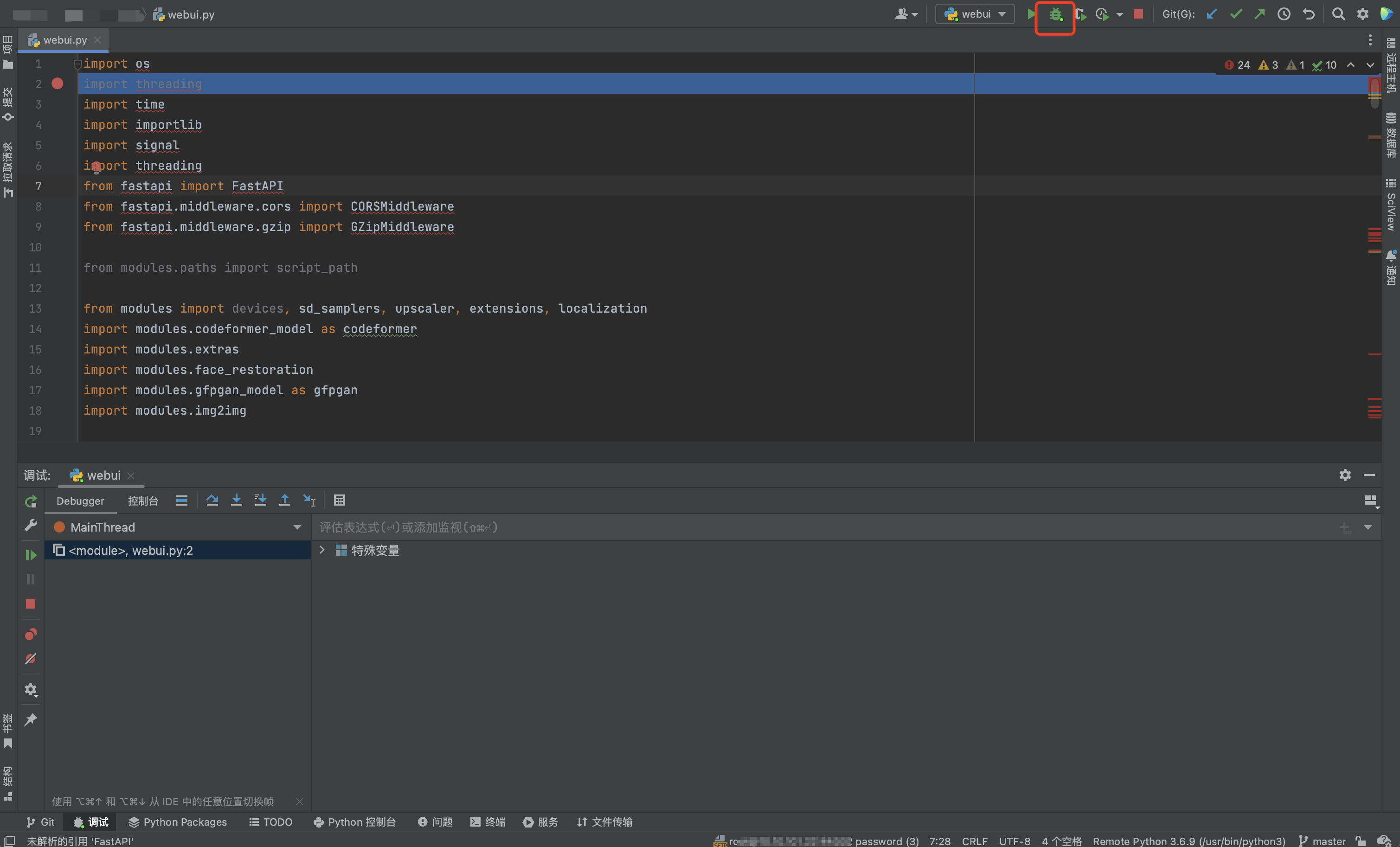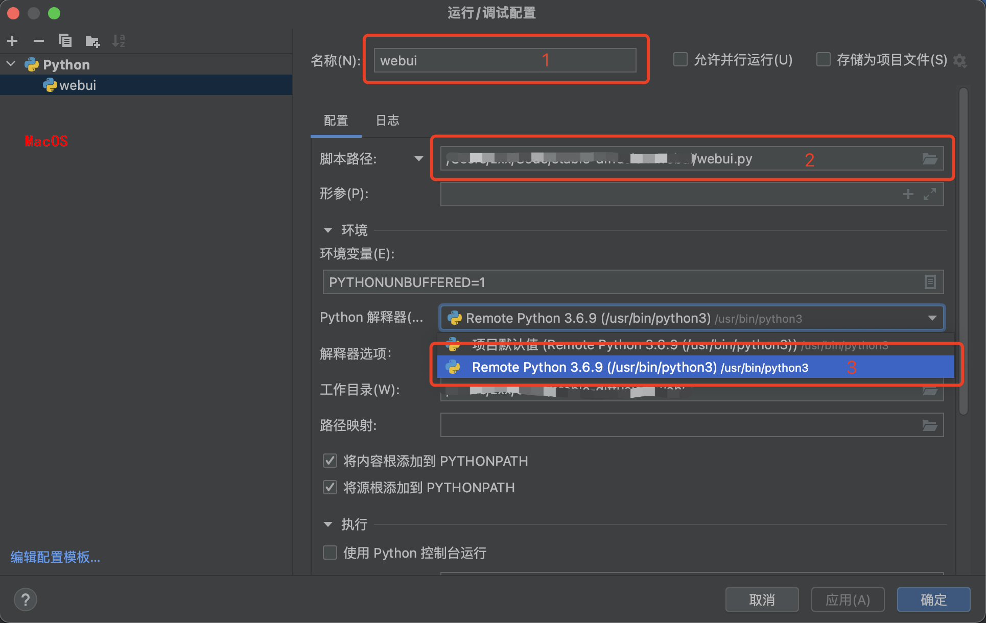 webui.py,须通过右侧文件夹图标打开对话框选择。Python 解释器:选择 “Remote Python 3.6.9”,根据你的开发环境实际情况,名字可能不一样。