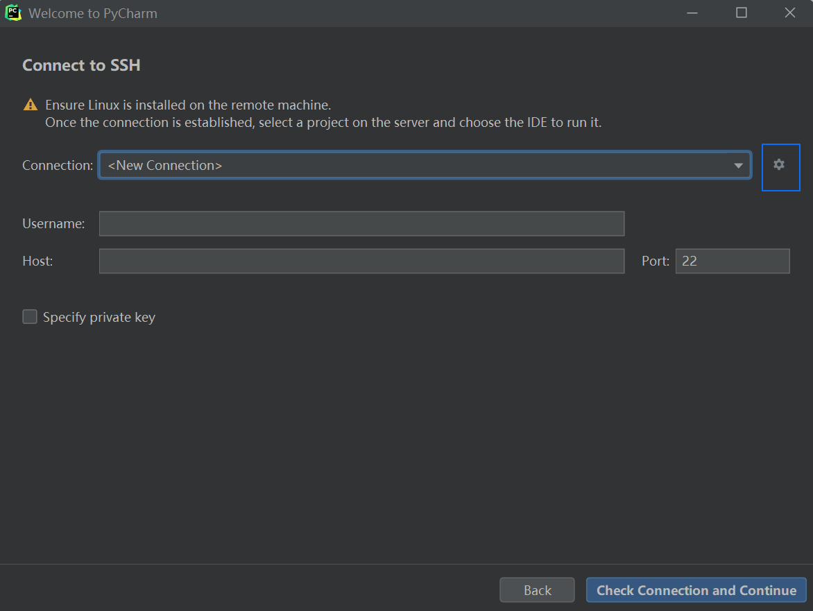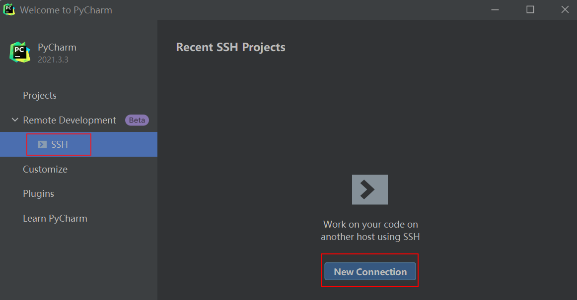 在 PyCharm 中选择 Remote Development > SSH ,随后单击 New Connection 按钮。