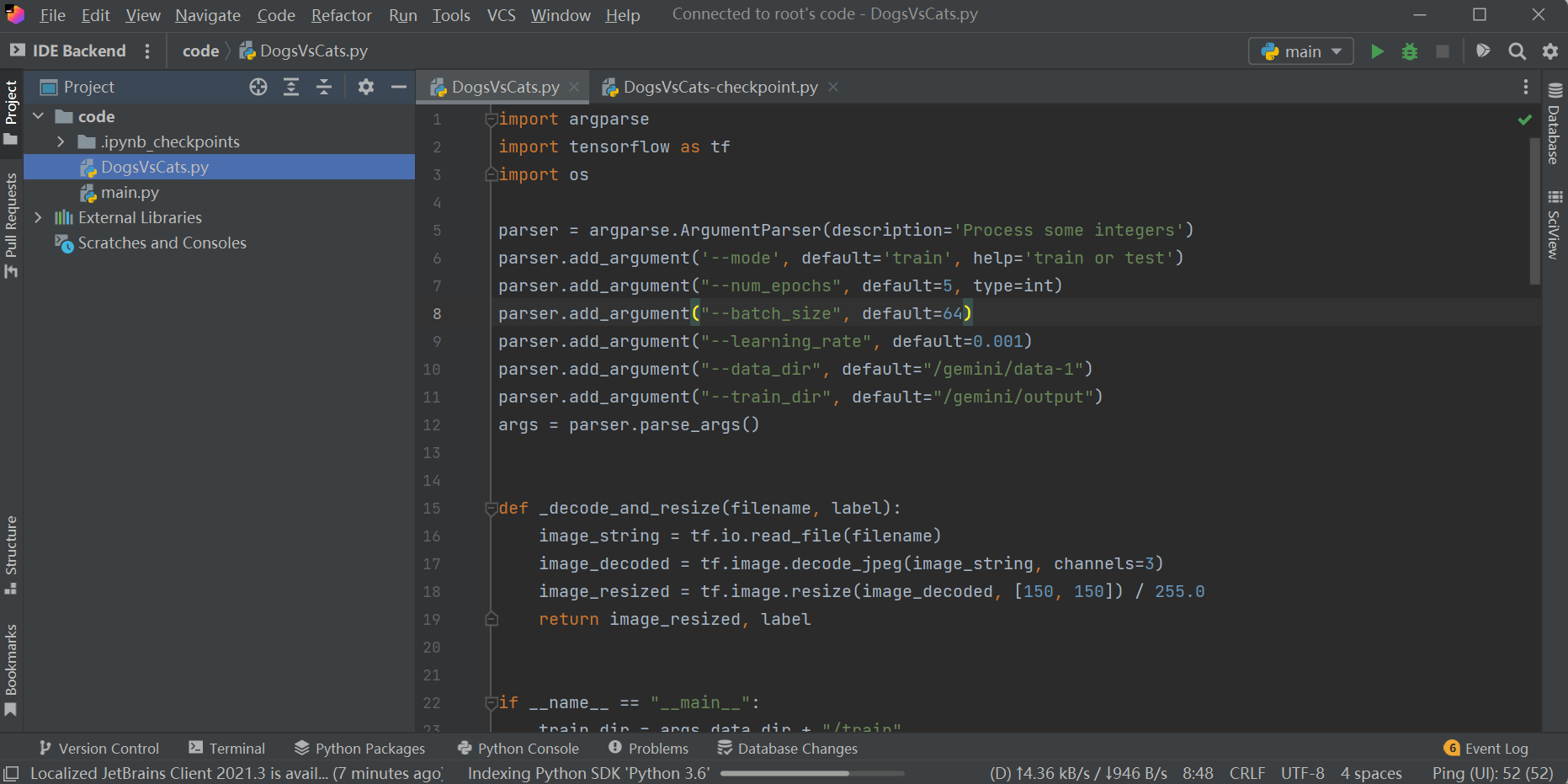 您已成功连接到开发环境,可在 PyCharm 上编辑您的代码集,保存的内容将会实时更新到您的远程开发环境上。