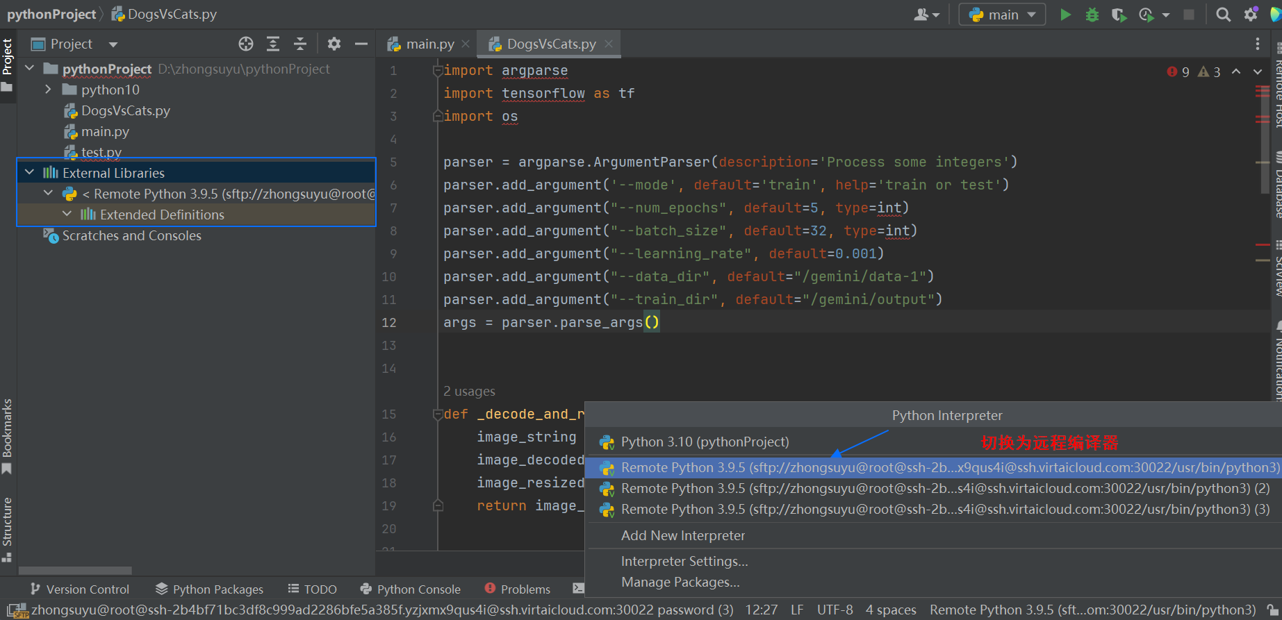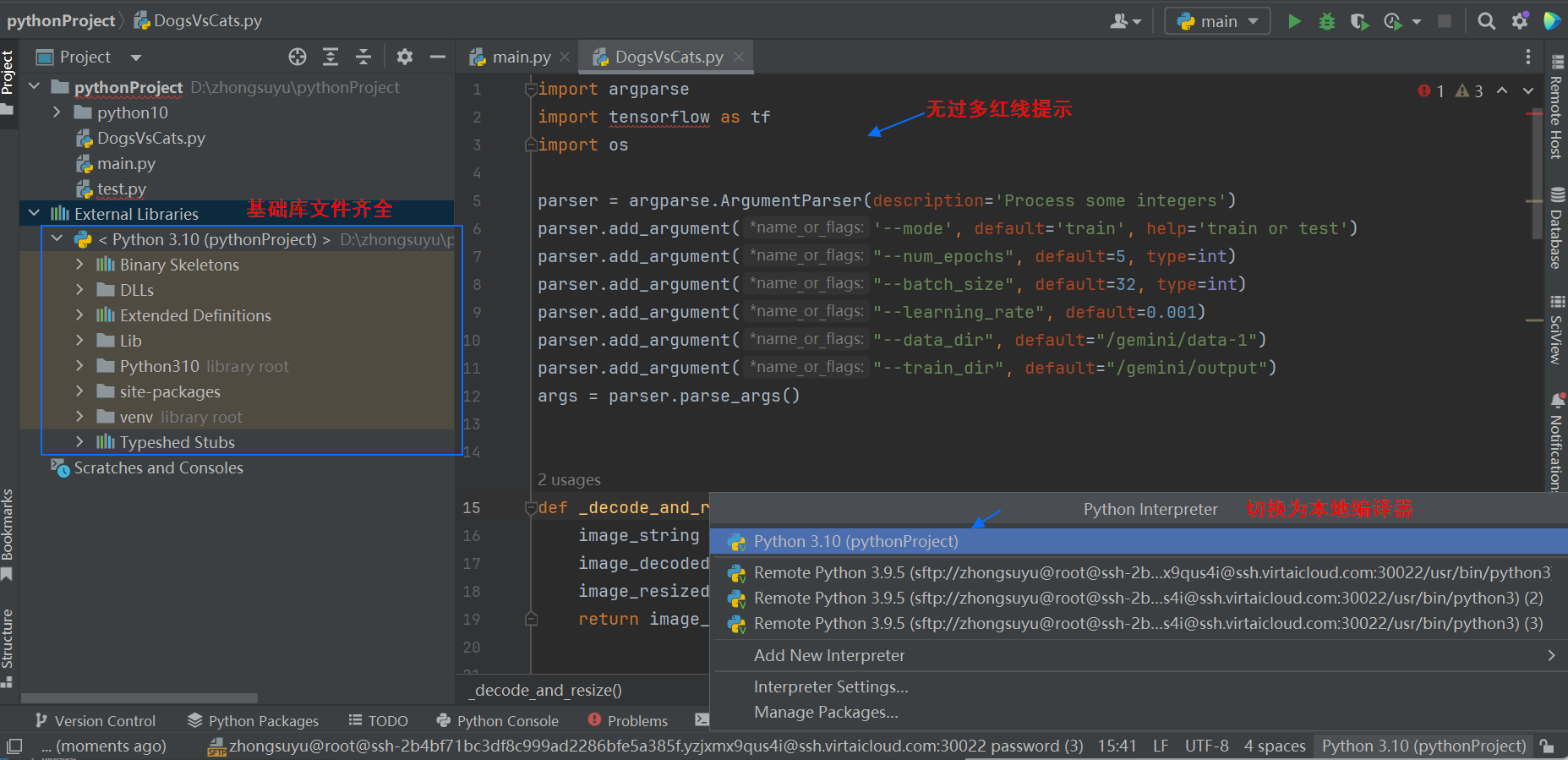 处理建议:本地开发,远程调试。 即本地开发时,右下角选择本地的 python 编译器;调试时,右下角选择远程的 python 编译器。