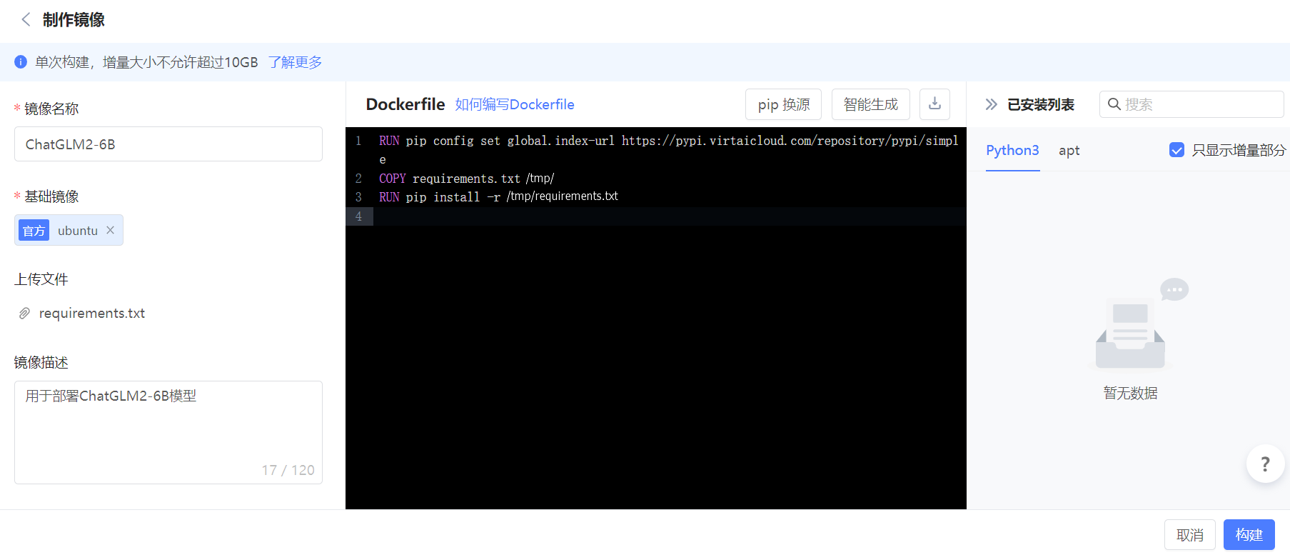 - 已安装增量列表中包含所有已安装包,其中有些包是作为某工具的依赖包而在安装该工具时自动安装的,智能生成的指令会将其作为目标包安装,构建时这种包可能安装失败,失败后可在 dockerfile 的安装指令中删除该包,让其仍以依赖包的方式被安装。