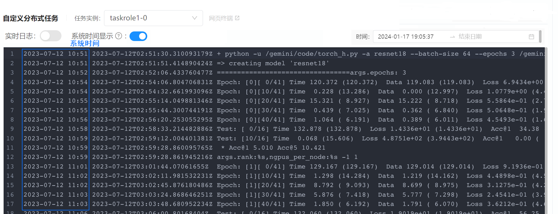 系统时间:即如图的第一列时间,为平台自动为您生成的,如您在日志中已设置了输出时间,可关闭 系统时间显示。