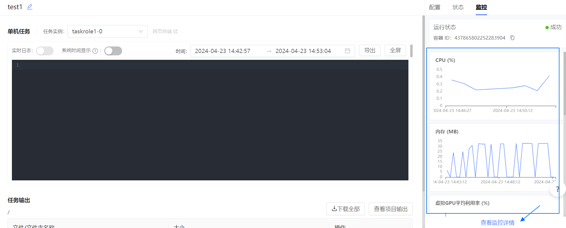 在任务详情页中,下拉框选择实例后,右边栏的 监控 页签可查看该实例的监控。