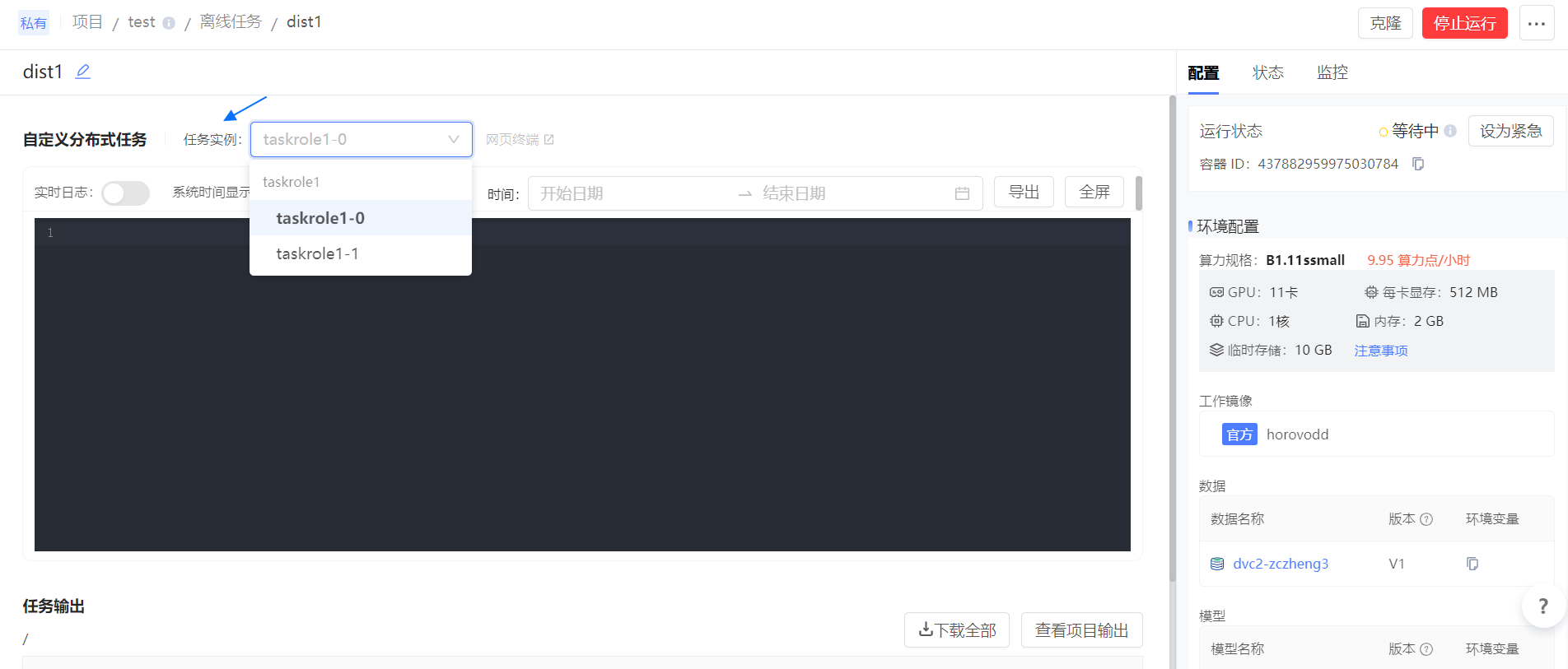 在任务详情页中,下拉框选择实例后,下方便会显示该实例的日志。