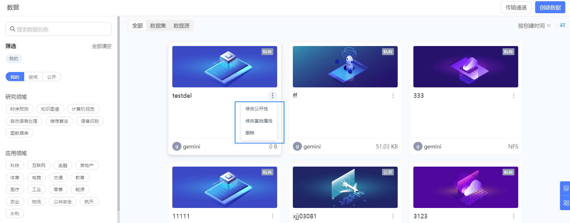 删除方法:单击数据卡片上的 ... 中的 删除,可删除数据集。