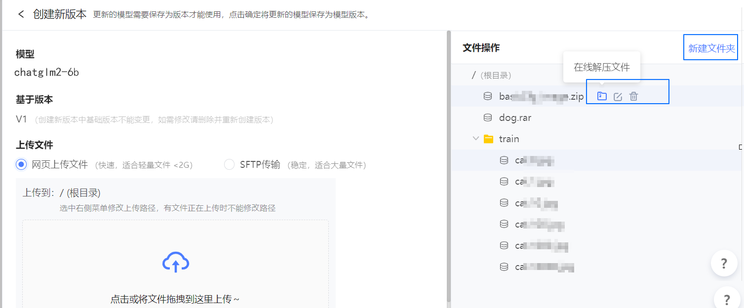 在 模型详情 页中,单击 创建新版本并更新模型 按钮,选择基础版本后,单击 确认。