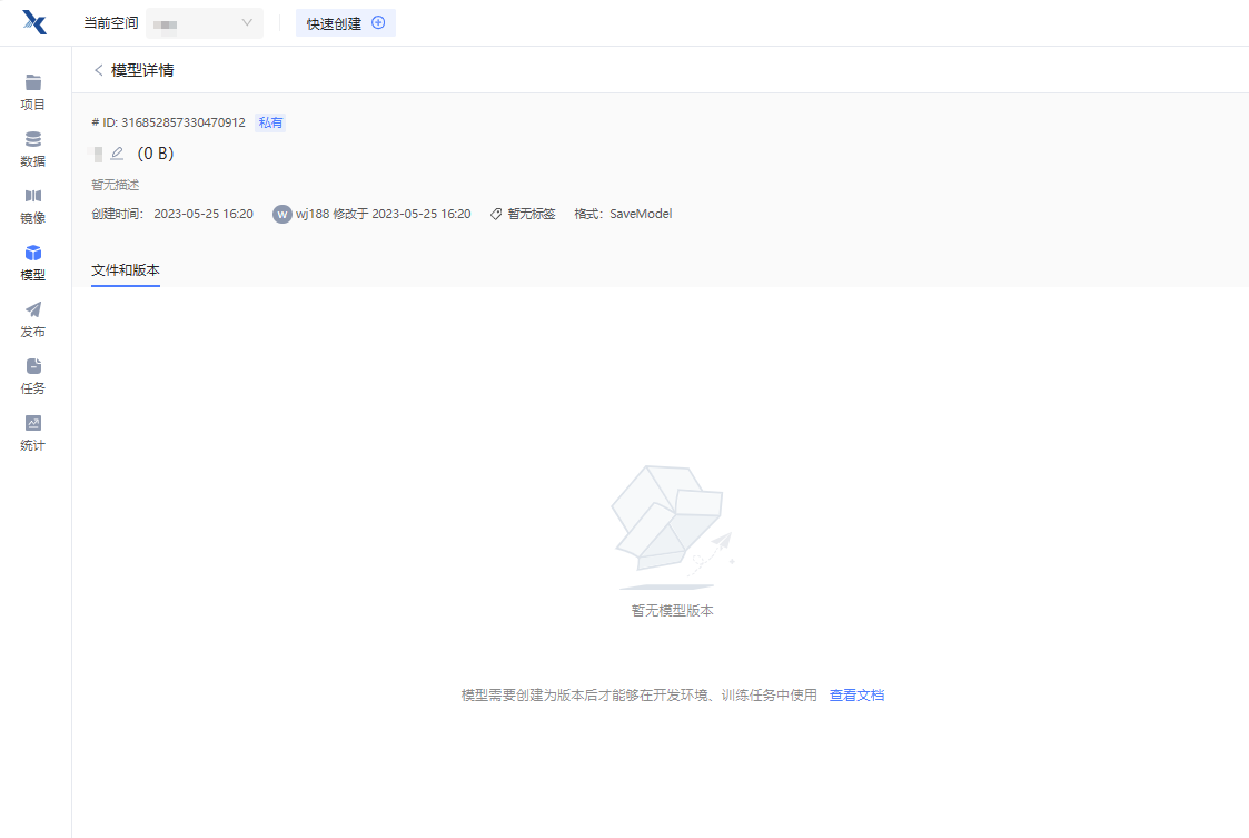 此次升级(2023年12月底)前新建的空模型,在升级后均无法新建版本和更新,模型详情中也不提供新建版本的按钮,如下图所示。建议您删除此空模型,重新创建和上传模型。