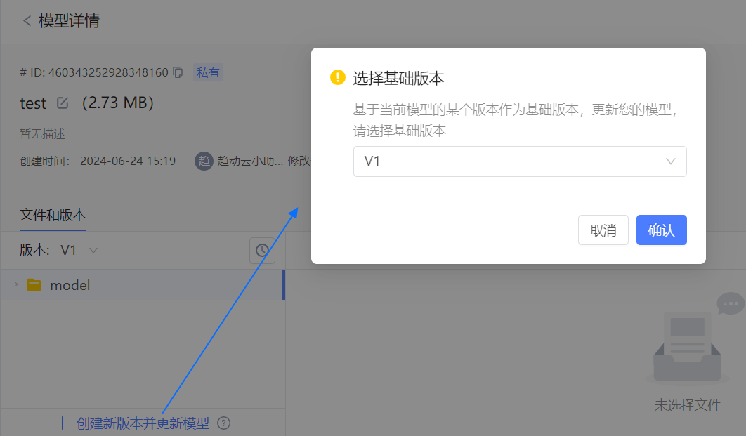 单击底部 创建新版本并更新模型,随后选择待下载的版本,并单击 确认。