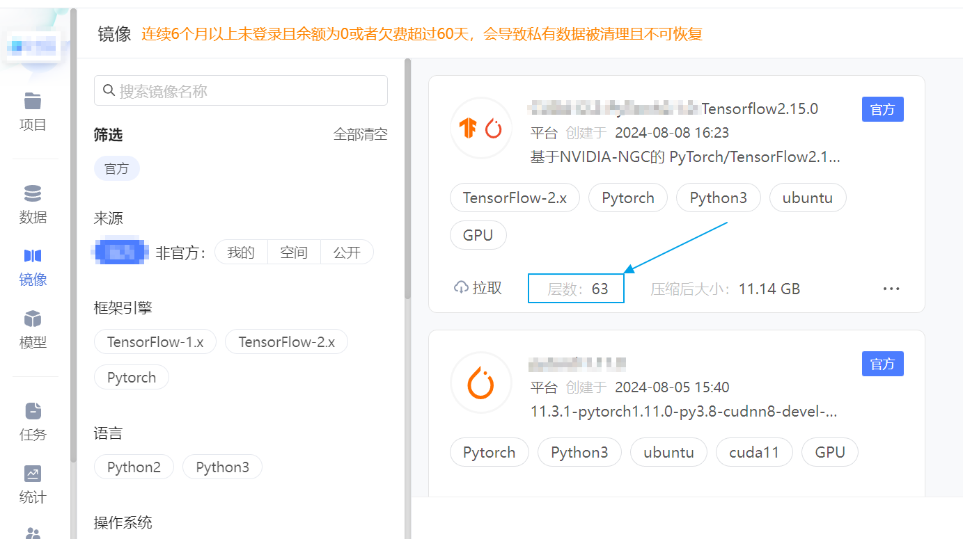 - 层数:镜像层数,参考 Docker镜像及分层结构,超过 120 层不可用于标准镜像构建。