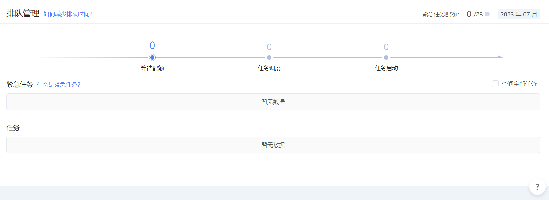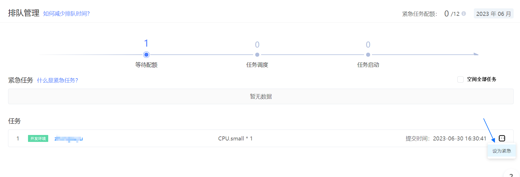 用户每月享有一定次数的将任务设为紧急的机会(即紧急任务配额),配额用完后需等待次月 1 日再次发放后才能使用,紧急任务配额可在平台顶部 中查看。