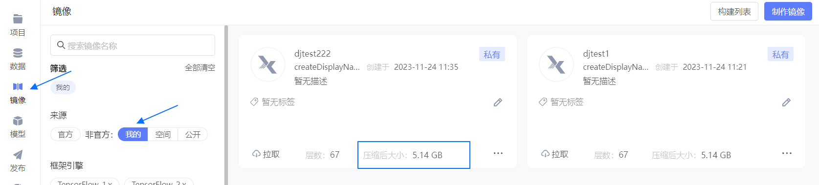- 用量查看:镜像 页中,各镜像卡片上 压缩后大小 即为该镜像的存储用量,官方镜像不占用持久化存储。