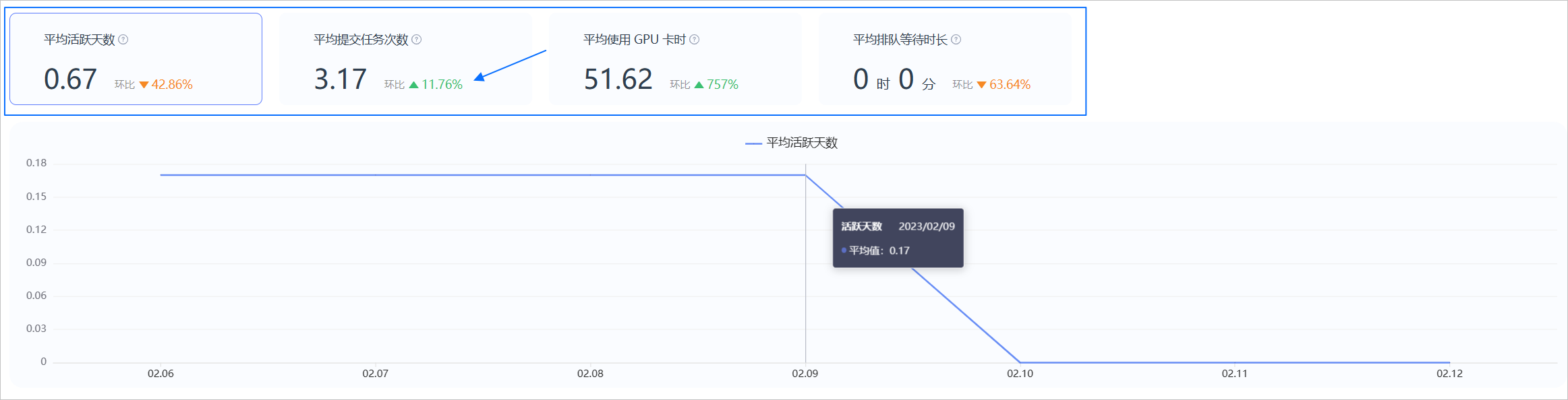 ③ 平均值查看:提供选中统计周期内数据平均值及环比数据,折线图为选中统计周期内使用GPU卡时平均值分布。
