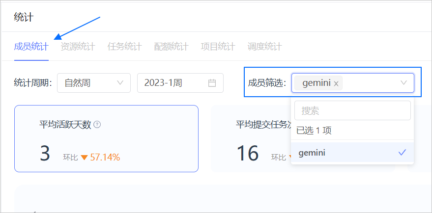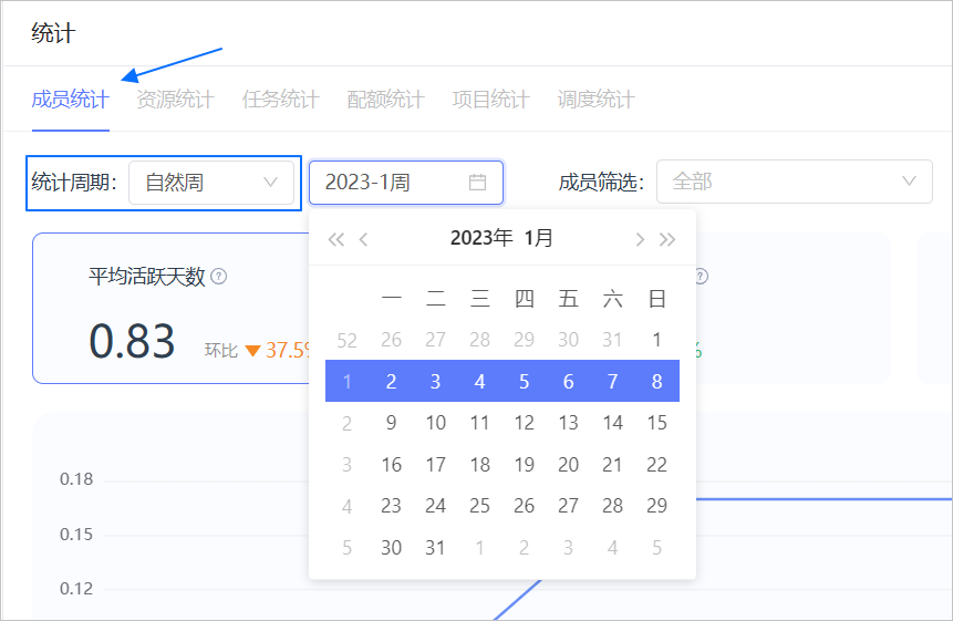 4. 选中菜单上方 成员统计 ,可按 统计周期成员筛选 筛选,查看平均值报表及数值详情。