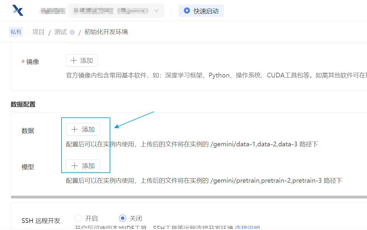 数据/模型保存版本后,即可在初始化开发环境中配置,或在开发环境停止时,在项目详情页进行修改,挂载时请注意所选择的数据版本。