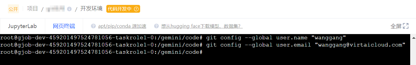 在开发环境的 网页终端 中执行如下命令,配置用户名和邮件地址。
