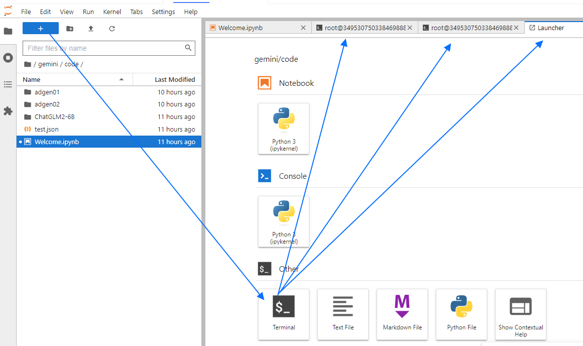 - 方④:使用 JupyterLab 自带终端运行任务,关闭网页并不会关闭 JupyterLab。(JupyterLab 可同时开启多个终端)