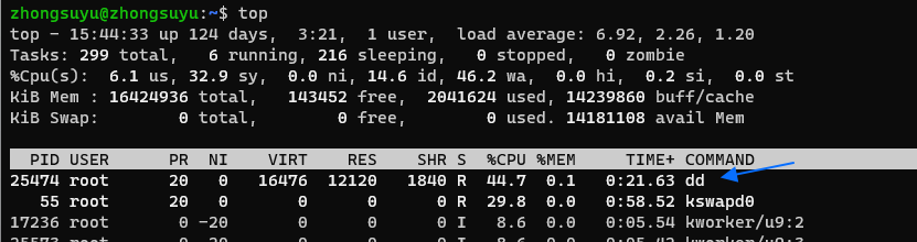 此时我们用top命令可以看到,有一个 dd 命令在执行,并且负载越来越高。只要不终止 screen 的进程,任务就会一直在后台执行。此时我们就可以做其他想做的事,而不必一直等着任务执行完成。也不必担心任务被中断,即使使用了logout命令。执行