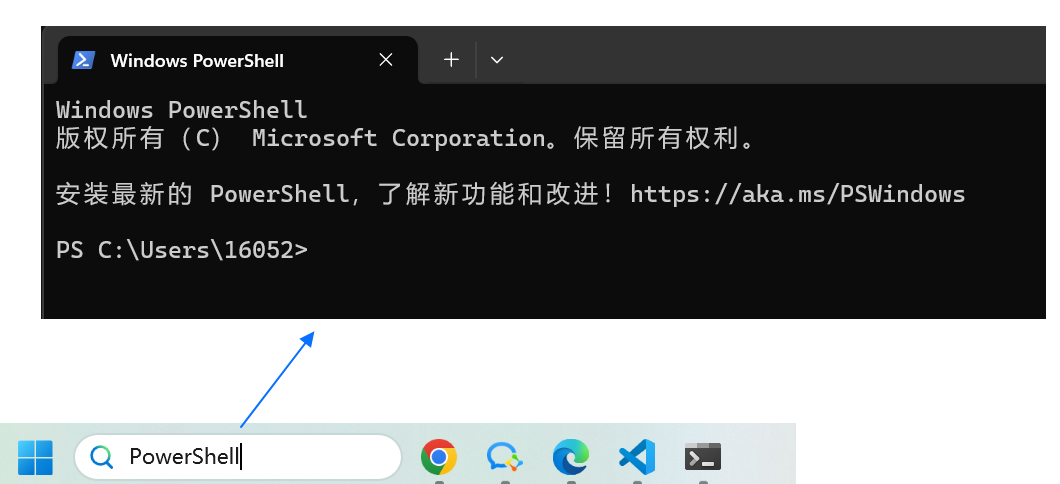 在底部搜索框中输入 PowerShell 并回车,打开 Windows PowerShell。