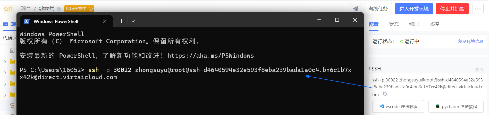 将开发环境的 SSH 连接信息复制粘贴到 PowerShell 中并回车。