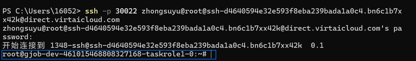 root@....-taskrole1-0:~#表明开发环境连接成功。连接成功后,可在本地 Terminal 中使用命令远程操作开发环境。
