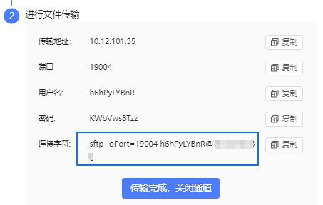 如返回如下信息,则输入yes。Are you sure you want to continue connecting (yes/no/[fingerprint])?返回如下信息时,输入 密码 并回车,密码 即 sftp 通道开启时给出的密码(如上图所示)。