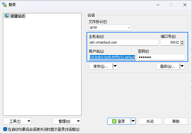 将获取的 SFTP 连接信息填写到 WinSCP 登录 窗口中。